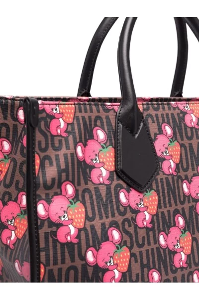 Moschino-tassen .. Bruine mouse-print draagtas van Moschino met koffiebruin, multicolour, all-over logo-print, all-over grafische afdruk, bovenste ritssluiting, verstelbare afneembare schouderband, twee bovenste handgrepen, hoofdcompartiment en interne slipzak.